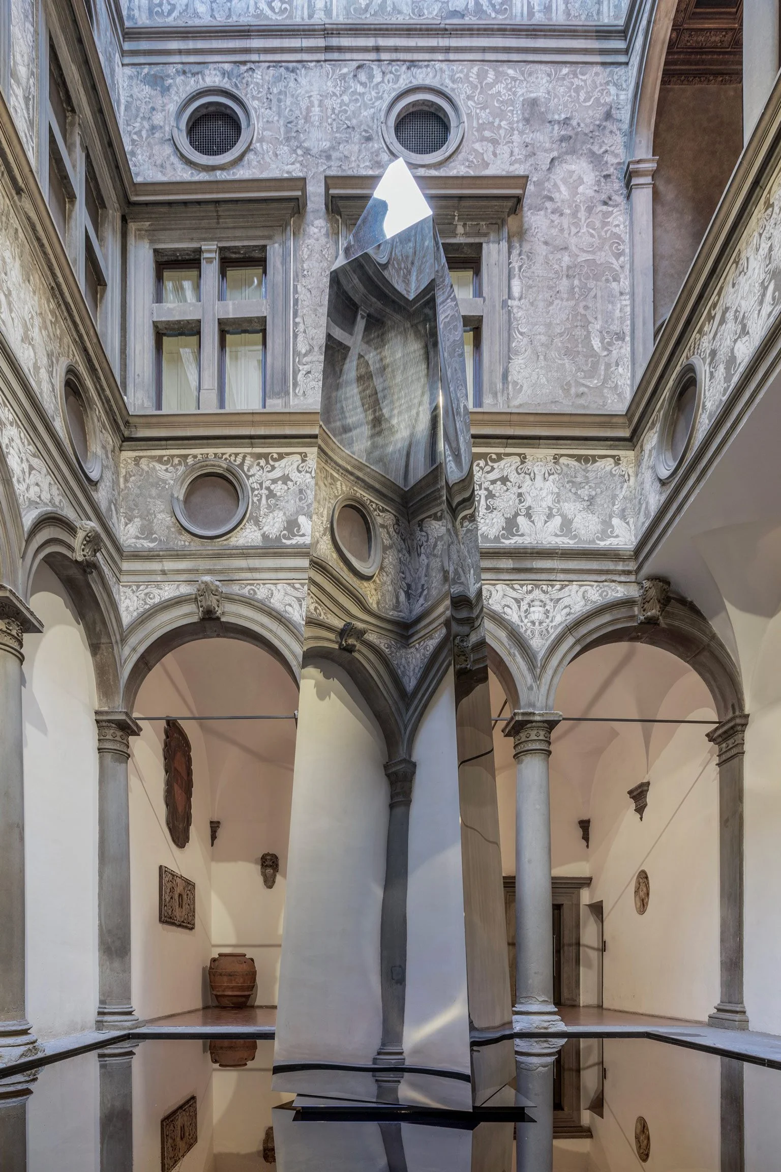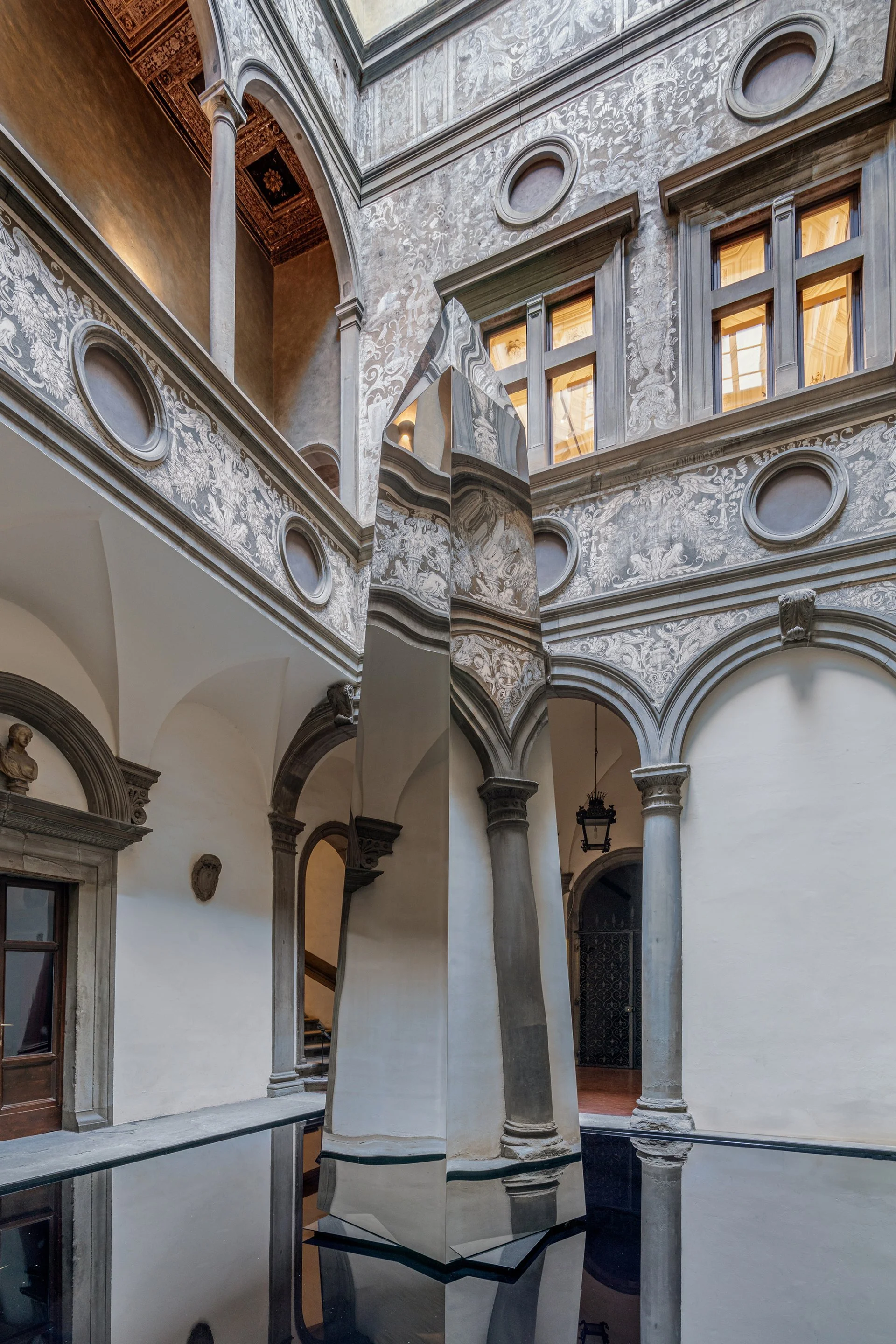 Abbiamo avuto l'onore di documentare "Pezzi di Pace", l'installazione site-specific di Felice Limosani ospitata nel cortile rinascimentale di Palazzo Bartolini Salimbeni, sede della Collezione Roberto Casamonti. L'opera, un obelisco rotante sospeso su uno specchio d'acqua, riflette l'ambiente circostante, invitando a una profonda riflessione sulla pace e sull'interconnessione tra cielo e terra.